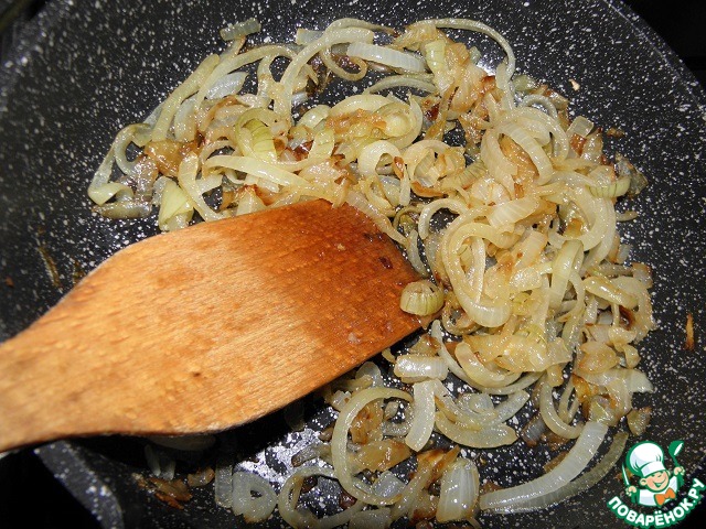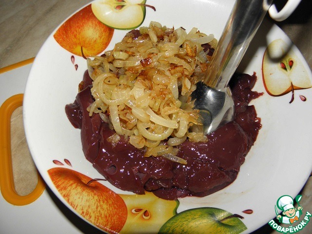 Печень очистить, промыть и порезать произвольно, добавить к ней жаренный лук, добавить специи и взбить блендером.