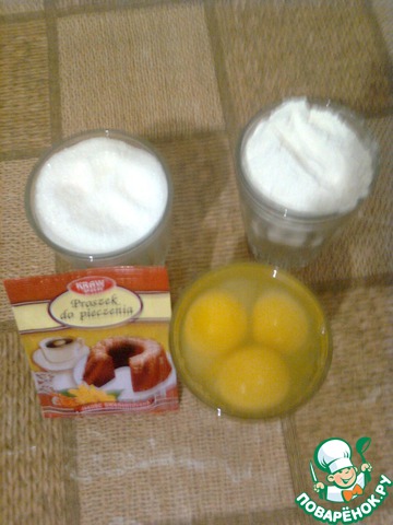 Приготовить все ингредиенты. Муку, сахар и яйца - все по 1 стакану. Заметьте, количество яиц не указывается, а столько, сколько войдет в стакан, в этом весь секрет этого бисквита. Всех ингредиентов должно быть поровну.