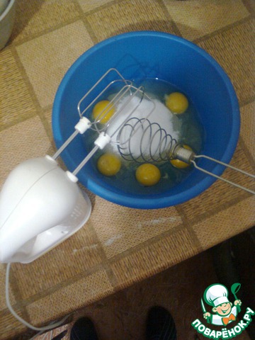 Яйца и сахар всыпать в миску вместе и взбить. Заметьте, вместе желтки с белками, а не отдельно.