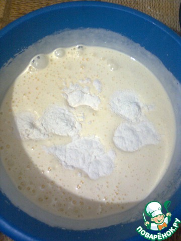 Теперь понемногу вводим муку с разрыхлителем теста. По 1 ст. лож. Медленно перемешивая в одну сторону.