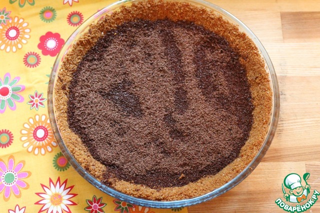 Вынемаем основу из духовки и сразу посыпаем ее темным шоколадом. Шоколад начнет таять на горячей основе. Температуру духовки уменьшаем до 150С.