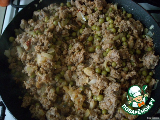 Лук измельчить и обжарить, добавить фарш, жарить до полуготовности, добавить томатную пасту, горошек и жарить до готовности.