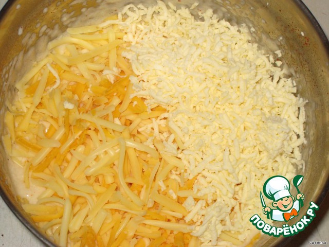 Добавить специи, горчицу, соль лучше не класть, сыры достаточно дают соли, перемешать.