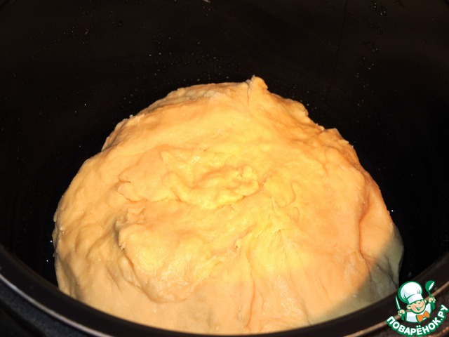 Постепенно соединить мучную и молочную смеси и замесить тесто. Скатать его в шар и положить в теплое место походить.