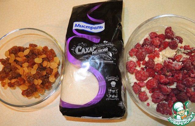 Для начинки творог смешать с тростниковым сахаром (желательно мелкий от "Мистраль"), яйцом и малиной. Изюм на 5 минут замочить в кипятке, затем обсушить.