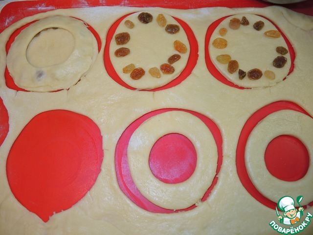 Раскатать тесто в пласт толщиной 4-5мм и вырезать одинаковые кружки, диаметром примерно 7-8см. У половины кружков вырезать серединку, диаметром примерно 2-3см. На целые кружки теста по кругу, немного отступив от края положить изюминки (это и есть секретик), накрыть кружком теста с дырочкой в серединке.