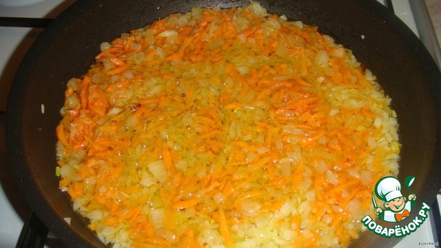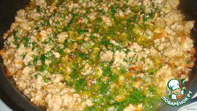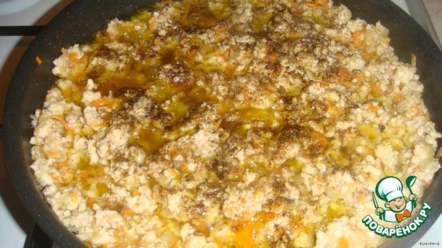 Фарш тоже добавить к луку и к морковке,добавить специи,соль,перец по вкусу и тушить 15 минут пока жидкость не уменьшиться