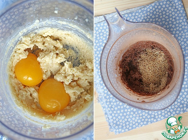 Всыспьте муку и какао, хорошо перемешайте, теперь молотые орехи (помол выбирайте на свое усмотрение) - снова перемешиваем.