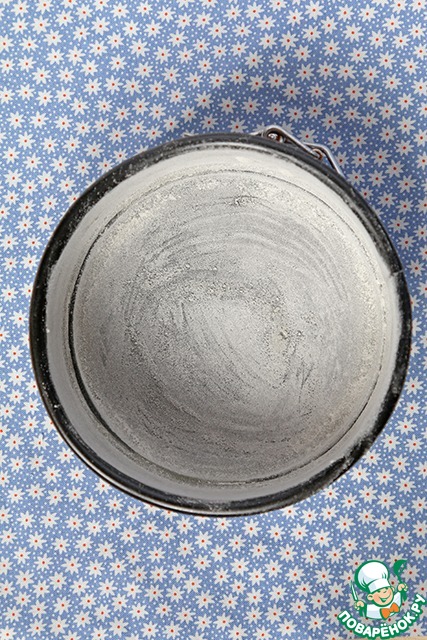 Теперь включите духовку разогреваться до 180 градусов, форму для выпечки смажьте сливочным маслом (я для этого топлю его в микроволновке и использую силиконовую кисть - очень удобно!) и присыпьте мукой.