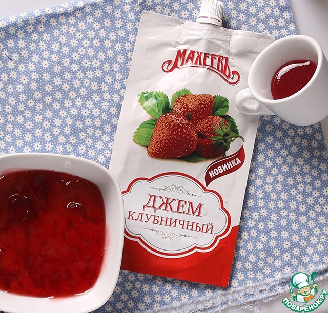 Для следующего этапа нам понадобится джем или варенье. я использовала клубничный джем ТМ Махеев. Кстати, вкус начинки Вы снова можете выбрать на свое усмотрение))