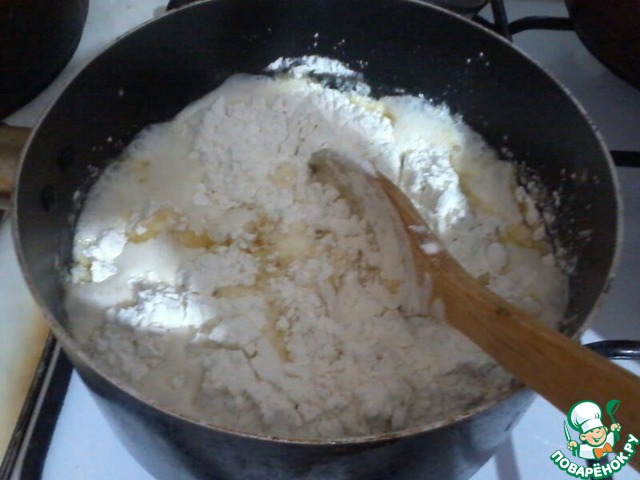 Тесто: молоко соединяем с маслом, солим, ставим на огонь и доводим до кипения. Добавляем муку и, постоянно помешивая, провариваем до исчезновения влаги. Снимаем с огня, остужаем.