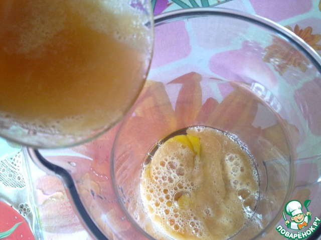 В отдельной емкости взбейте яйцо, добавьте свежевыжатый яблочный сок, жидкий мёд и растительное масло. Тщательно всё смешайте до образования однородной массы.