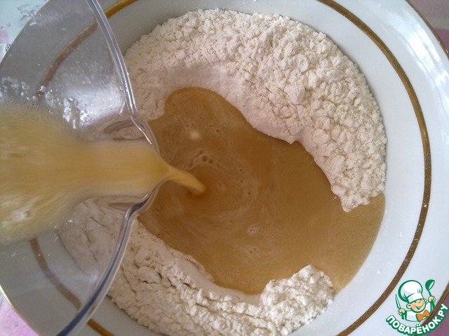 Аккуратно введите жидкие ингредиенты в сухие. Cмешайте. В тесте не должно быть комочков.