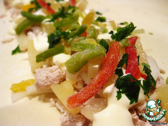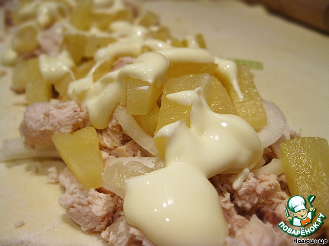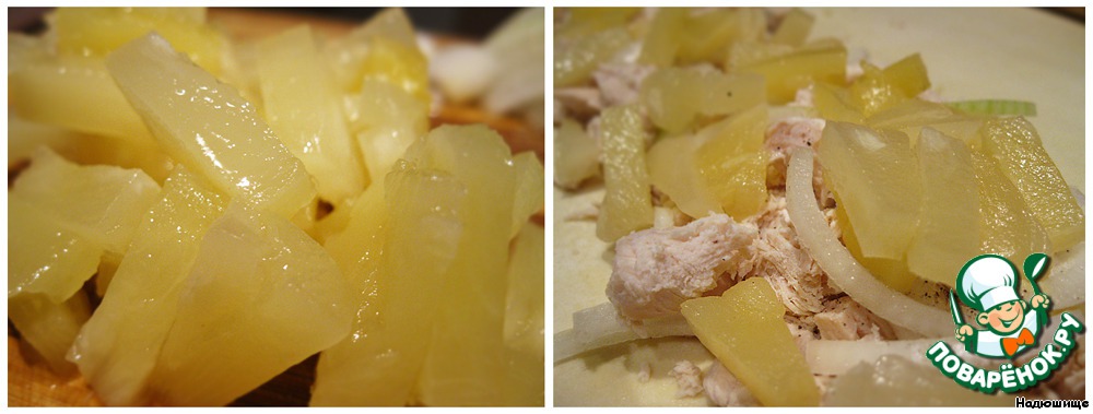 Открываем баночку с ананасами, нарезанными кусочками. Кладем поверх начинки.