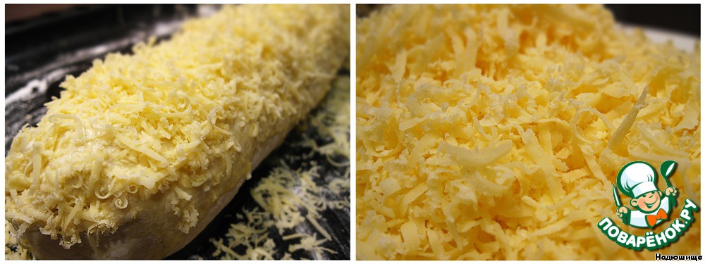Трем твердый сыр и густо насыпаем его поверх пирога. Для улучшения вкуса, можно добавить сыр и в начинку.