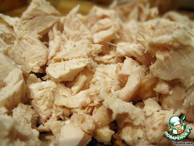Для приготовления пирога нам нужно отварить куриное филе до готовности. И порезать кубиками.
