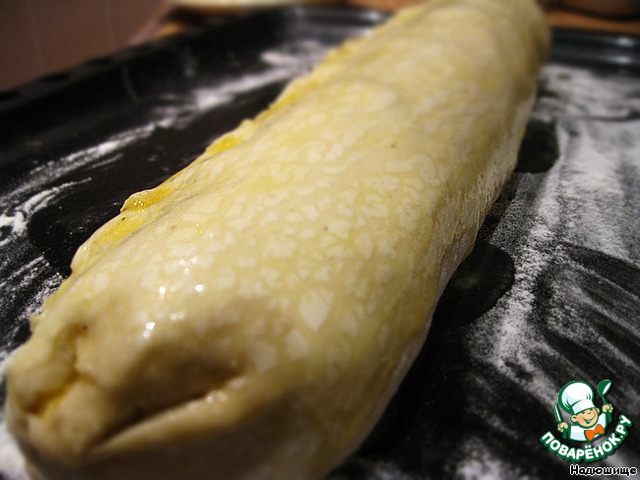 Противень засыпаем мукой, выкладываем на него пирог. И смазываем яйцом поверхность рулета.