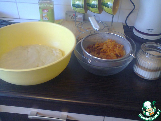 Наши продукты. Приготовить тесто, в смесь тёплого молока и растительного масла добавить растёртые с солью и сахаром дрожжи, муку и поставить тесто на расстойку в тёплое место. Муки может уйти и чуть больше или чуть меньше, тесто должно быть мягким и нежный слегка влажным ( не забивайте его мукой). Изюм и абрикосы промыть тёплой водой и дать воде стечь чтобы они просохли.