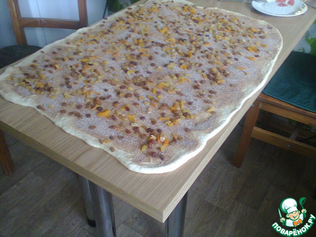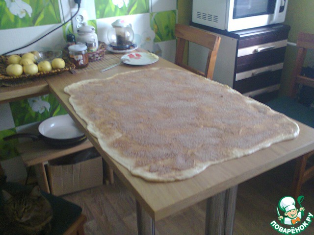 Наше подошедшее тесто раскатать тонко, смазать размягчённым маслом, и посыпать довольно обильно смесью сахара, корицы и ванильного сахара. Тесто нейтральное по вкусу, я использую одно тесто когда готовлю кранчи, один рецепт как для сладкого так и для солёного. У меня в банке всегда стоит в запасе сахар смешанный с корицей для начинки. На 1 кг. сахара я беру 2 пакета по 15 гр. корицы и 2 пакетика ванильного сахара по 20 гр. Количества корицы и сахара для начинки даю примерное.. Слой раскатанного теста должен быть щедро посыпан сахаром с корицей иначе выпечка будет бедновата на вкус. Посыпьте как у меня, если вам покажется много или мало сахара в следующий раз можно подкорректировать количество сахара.