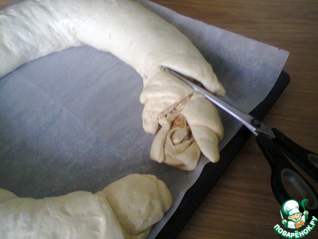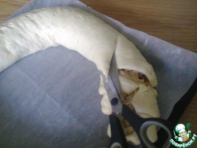 Скрученный в тугой рулет перекладываем наш кранч на противень и формуем его при помощи разрезания ножницами наискосок, вот так.