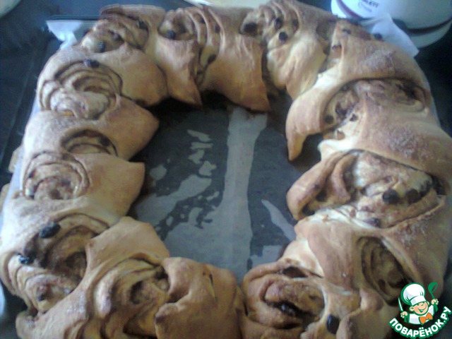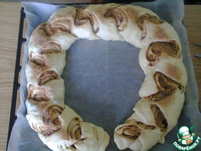 После разрезания подгибаем края срезов под низ получается аккуратная косичка. Смазывать тесто не обязательно, если хотите, чтобы корочка получилась мягкая. Для хрустящей корочки смажьте рулет из теста перед разрезанием маслом, а уж потом разрежьте, так же присыпать сахаром с корицей разрезанный рулет перед выпечкой тоже не обязательно. Поставить наш кранч печься в предварительно разогретую духовку при температуре 180 гр. Первые 10 минут выпекания не открывайте дверцу духовки, чтобы тесто равномерно поднялось. Как только кранч стал светло коричневого цвета проверьте его на готовность лучинкой если нет сырого теста, можно вынуть кранч и покрыть салфеткой. Не передержите его в духовке иначе он пересохнет и сахар начнет гореть.