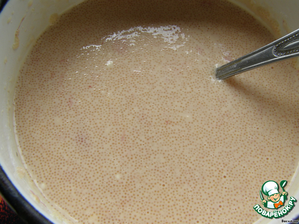 Получается вот такая масса. На обычные оладьи у меня тесто бывает гуще, здесь получается пожиже.