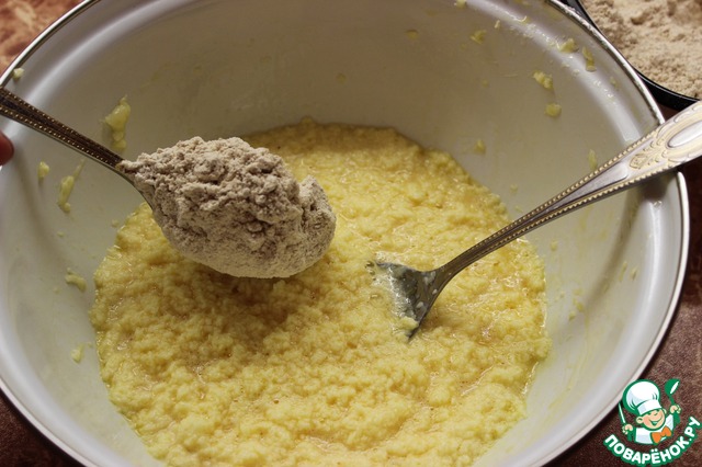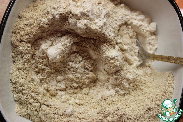 Сухую смесь смешиваю с яично-медово-масляной смесью. Тщательно перемешиваю.