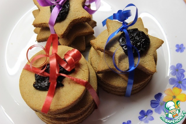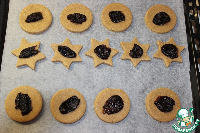 Выкладываю печенье на противень, внедряю в середину каждой по половинке чернослива. Выпекаю в духовке 10-15 минут при 180 градусах.