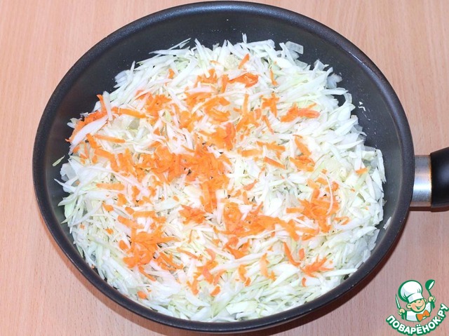 Добавить к луку очень тонко нарезанную капусту и тертую на крупной терке морковь.