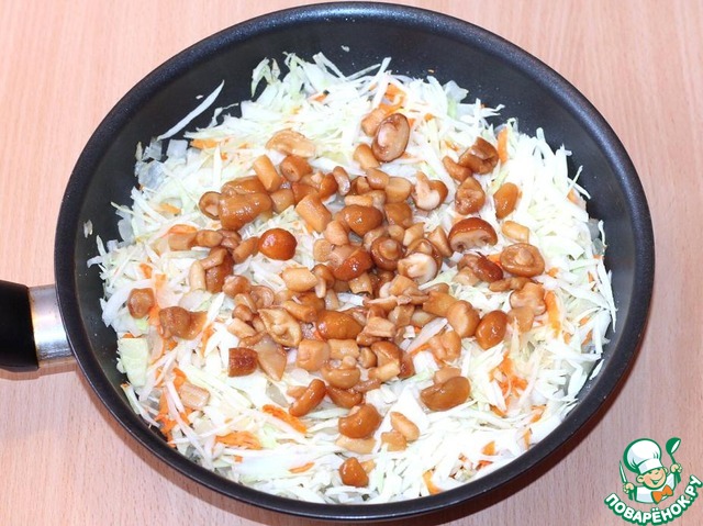 Грибы очень тонко нашинковать. Добавить грибы к капусте. У меня грибы свежезамороженные, я их не отваривала. Готовить на среднем огне, помешивая, 5 минут без крышки, а потом накрыть крышкой и готовить ещё 8-10 минут до готовности.