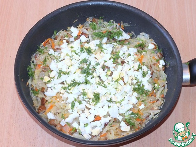 Добавить в сковороду порезанные кубиком варёные яйца и мелко порезанный укроп. Приправить солью и перцем.