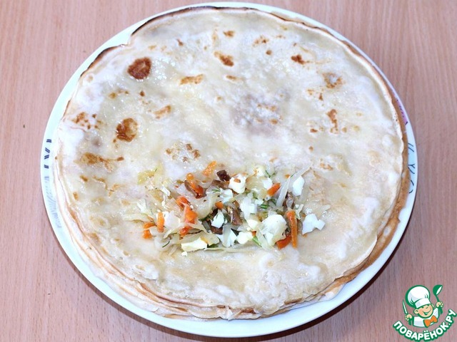 На середину каждого блина выкладывать по 2 ст. л. начинки.