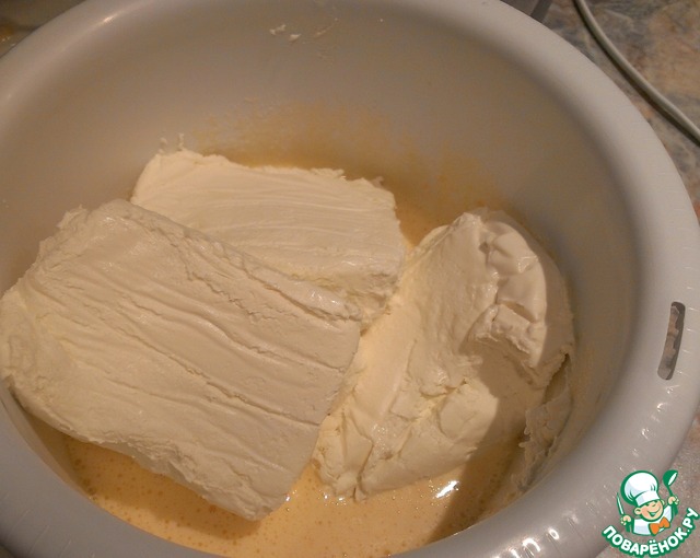 Добавим творог и все перемешаем миксером до однородного состояния.