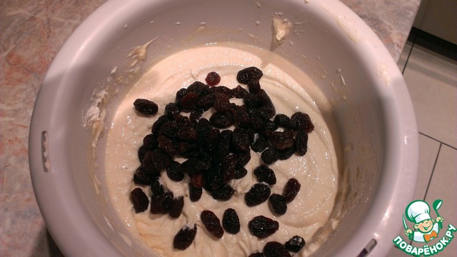 Вот и дошла очередь положить вымытый и обсушенный полотенцем изюм, который просто перемешаем ложкой.