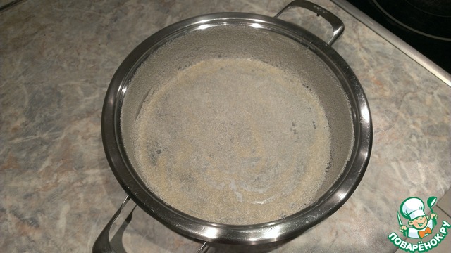 Форму или высокую сковороду смазать сливочным маслом и присыпать манкой (внутренний диаметр моей сковороды 24 см)