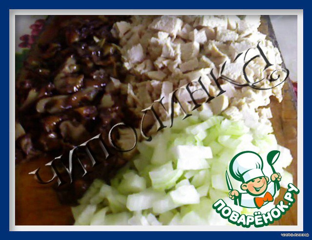 Куриное филе (у меня осталось немного уже вареного, его и использовала) помыть, нарезать мелкими кусочками, лук почистить, мелко нарезать, грибы тоже мелко нарезать.