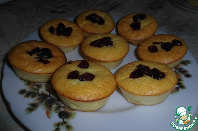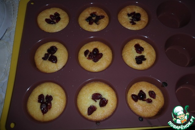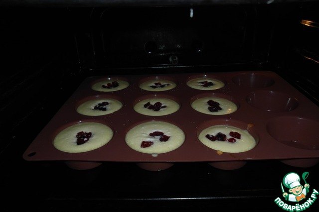 3. Формочки для кексов (силиконовые) сбрызгиваем водой. Выкладываем творожную массу ложкой, посыпаем сверху сушеной вишней. Ставим в разогретую до 180-200 градусов духовку на 25-35 мин.