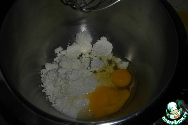 1. Творог смешаем с сахаром, ванилином и яйцами.