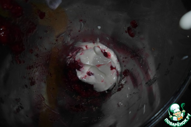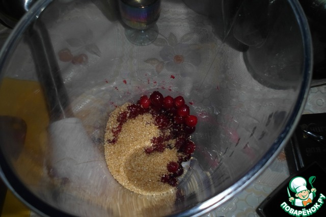4. Пока пекутся сырники - приготовим соус. В погружном блендере смешаем сахар и клюкву.