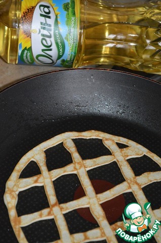 Печем "Ажурные" блинчики. В этом нет никакой сложности, только несколько советов. Тесто не должно быть слишком жидкое и в нем недолжно быть комочков, иначе они будут забивать дырочку, через которую выливается тесто, ну и конечно использовать подходящее масло для жарки "Олейна". Можно конечно испечь обычные блинчики и завернуть в них начинку, но согласитесь так интереснее.