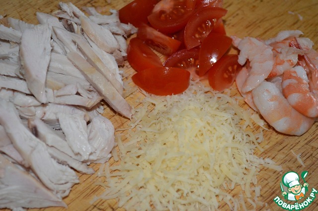 Куриное филе запекаем в духовке (можно просто отварить) до готовности, затем режем на полоски. Креветки отвариваем, чистим и разрезаем пополам. Помидоры моем и режем дольками. Листья салата моем и сушим. Сыр трем на мелкой терке.