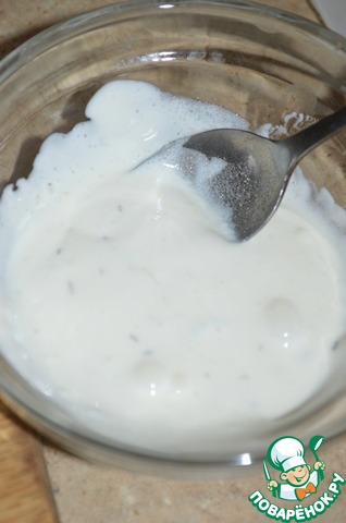 Для соуса в натуральный йогурт добавляем "Итальянские травы", соль и измельченный чеснок. Все хорошо перемешиваем.