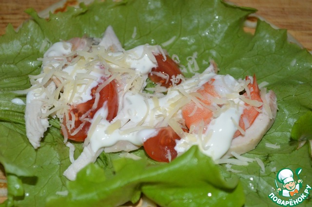 На листья салата выкладываем кусочки курицы, креветки, черри и поливаем соусом, сверху посыпаем тертым сыром. Аккуратно скручиваем лист салата и заворачиваем его в блинчик.
