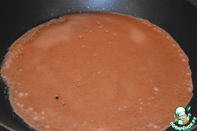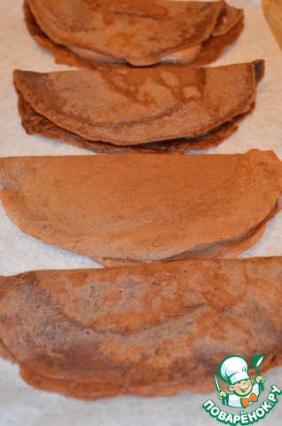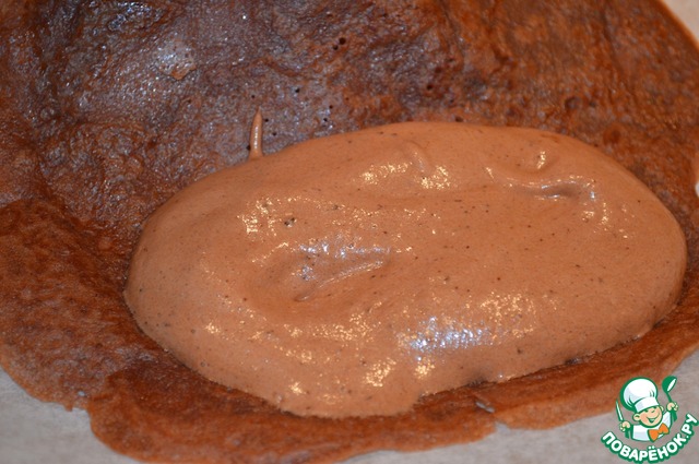 Противень застилаем бумагой для выпечки и выкладываем на него блины. На одну половину блина выкладываем по 2 ст. л. шоколадного суфле и накрываем второй половиной, НЕ ПРИДАВЛИВАЯ.