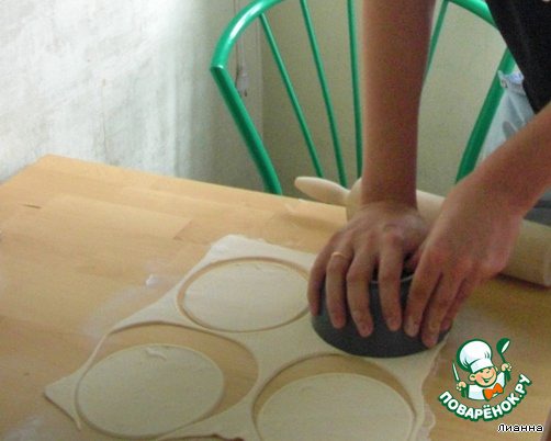 Готовое тесто разморозить, раскатать первую пластину теста, нарезать круглой чашей круги.