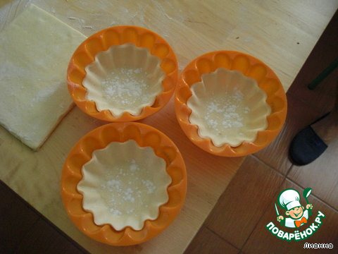Уложить круги в формочки для корзиночек. Присыпать крахмалом по 0,5 ч. л. - он впитает излишек влаги от ягод.
