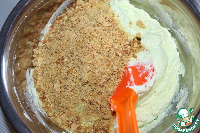 После того как ввели весь крем в масло, добавляем меренгу частями и аккуратно перемешиваем. В конце добавляем наше фисташковое пралине и еще раз аккуратно перемешиваем.