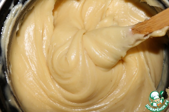 Тесто остудите до 80 градусов и начинайте взбивать, добавляя по одному яйцу. Заварное тесто должно получиться пластичным, гладким и блестящим (кстати, из нее же делают эклеры и профитроли).