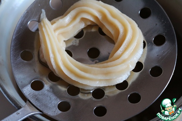 Поставьте разогреваться масло для фритюра. Переложите тесто в кондитерский мешок и отсаживайте тесто в виде колечек (я делаю это прямо на шумовку, без всякой пергаментной бумаги-считаю что так практичней и удобней). Жарьте пончики до золотистого цвета. Во время жарки они должны свободно плавать в масле, тогда они хорошо поднимаются и прожариваются.
