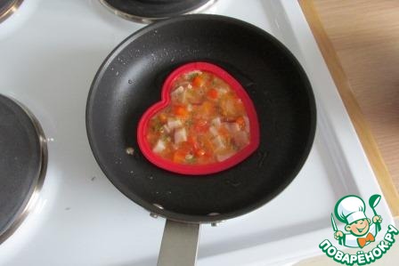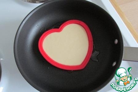 Печь блинчики будем в формочке для яичницы или на самой маленькой сковороде. Сковородку слегка смазываем подсолнечным маслом, кладем формочку и вливаем внутрь несколько столовых ложек теста.